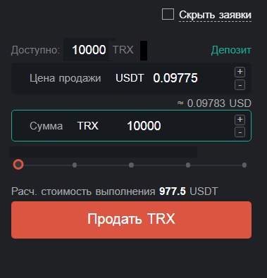 По центру расположены две формы для создания ордеров на покупку и продажу. В правой форме укажите цену продажи, ниже укажите сумму и жмите красную кнопку: Продать TRX