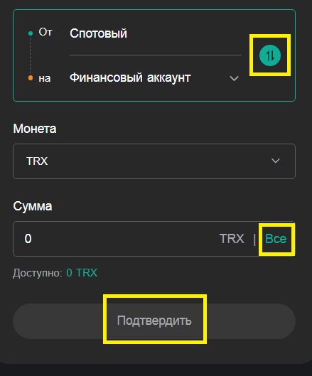 Перед вами откроется форма для перемещения активов: при помощи кнопки переключения аккаунтов установите: Спотовый (вверху), а Финансовый аккаунт (внизу) - как показано на скриншоте ниже, выберите сумму - нажав на значение: "Все" и жмите по кнопке "Подтвердить"