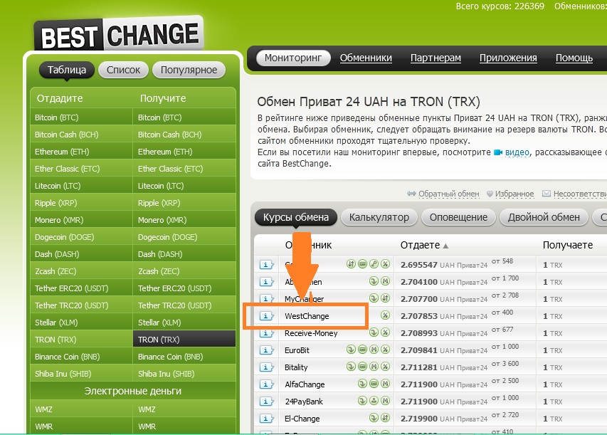 После перехода на мониторинг,- в левом столбце: "Отдадите" выберите удобный для вас способ оплаты, в моём случае Приват 24 UAH, в правом столбике "Получите" выберите TRX (Tron) После этого перед вами откроется список с множество обменных пунктов - если среди них есть "West Change" выбирайте его, поскольку я пользуюсь этим сервисом уже не один год!