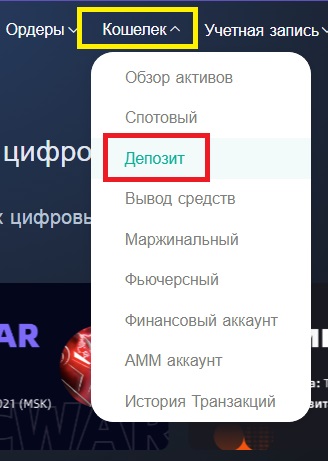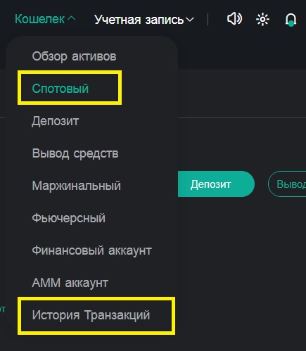 3) Когда вы завершите процесс обмена - перейдите на биржу и проверьте свой баланс - для этого в верхней части откройте "Кошелёк" и перейдите в разделы: Спотовый или История транзакций