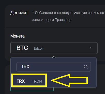 После перехода в данный раздел, - немного ниже, по центру - найдите поле для поиска нужной криптвалюты: жмите на надпись: BTC, откроется поле для поиска, введите в него: TRX (Tron), после чего, ниже - вы увидите результат: TRX (Tron) - жмите на него.