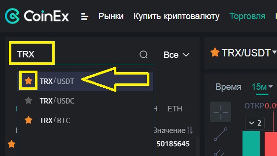 Для того чтобы создать ордер на продажу TRON - вверху откройте раздел: "Торговля" в левом верхнем найдите поле поиска и введите в него большими латинскими буквами: TRX. Поставьте звёздочку напротив пары TRX / USDTи жмите по ней.