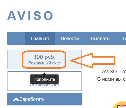 После регистрации и авторизации на AVISO вначале необходимо пополнить рекламный баланс или заработать деньги на выполнении различных заданий - здесь вы сами выбираете удобный для вас вариант.