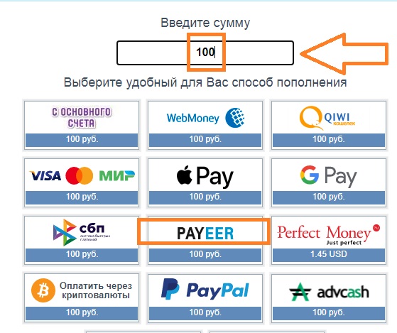 2) На открывшейся странице - укажите сумму для пополнения и выберите платёжную систему, в своём случае, я использую Payeer, деньги зачисляются моментально!