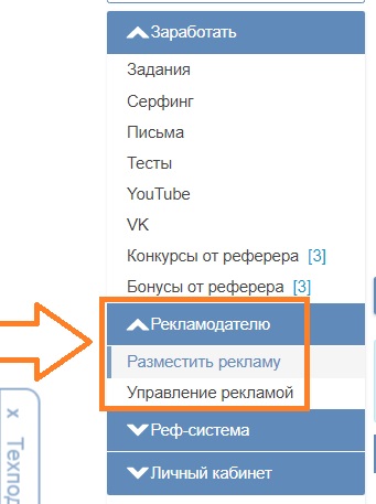 3) Когда на рекламном или основном счёту - будет определённая сумма, можно приступать к созданию задания, для этого в меню слева - найдите раздел: "Рекламодателю" откройте его и перейдите в подраздел: "Разместить рекламу"
