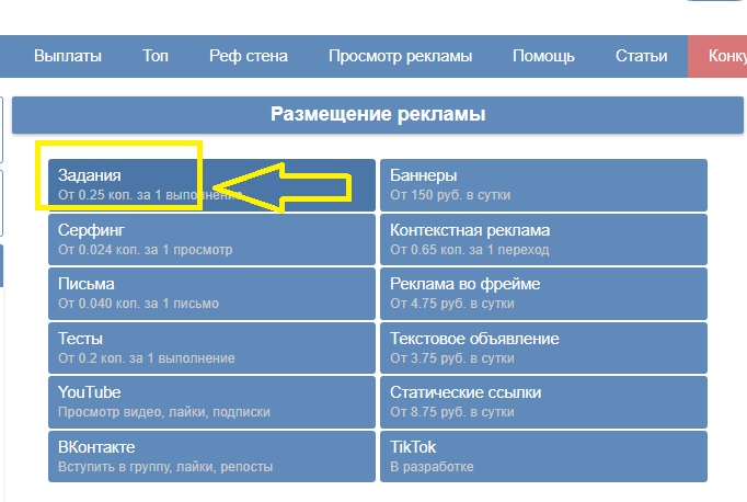 4) Теперь необходимо выбрать первую категорию: "Задания" - нажать по ней и опустится немного ниже.
