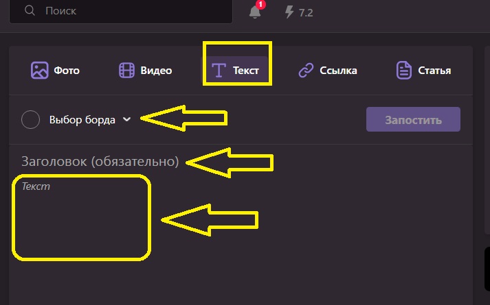 1) Выберите вариант поста: "Текст"