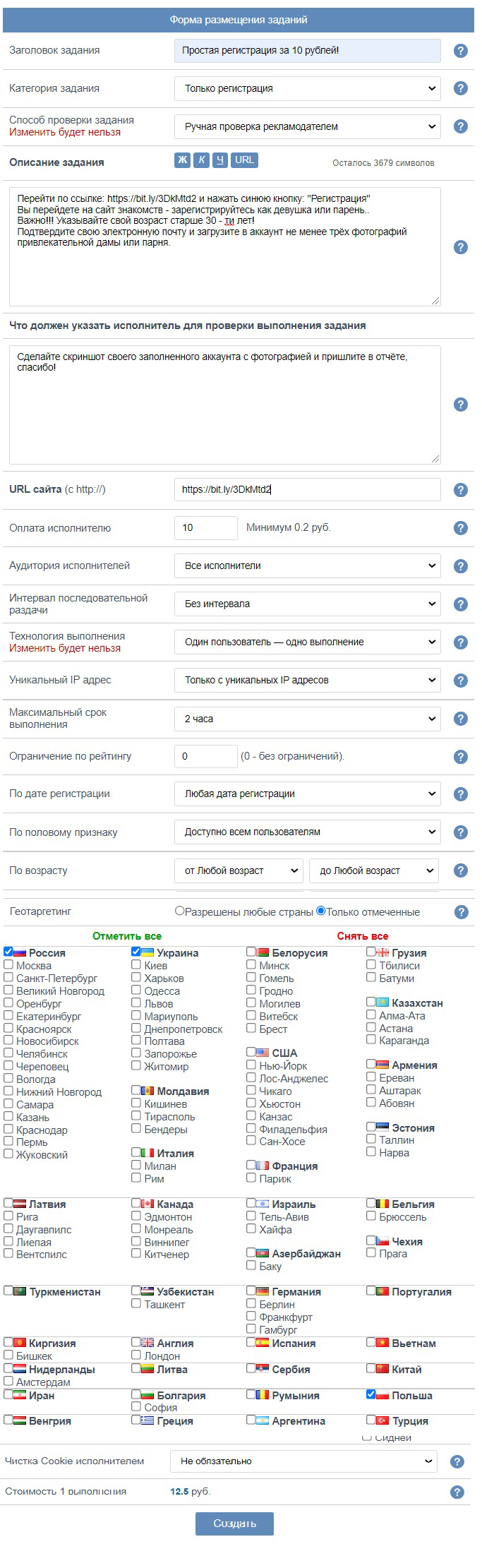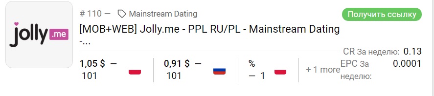 Трафик на этот оффер принимается с РФ и Польши, в среднем за регистрацию платят 1 USD.