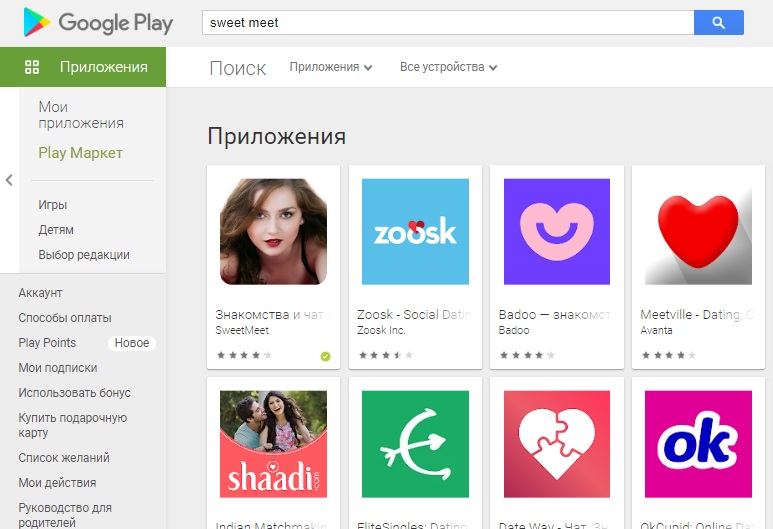Переходим в Google Play Market - где я подобрал несколько приложений для знакомств в интернете.