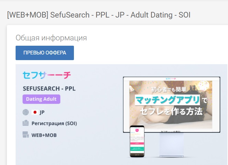 SefuSearch - кэжуал оффер под Японию с фокусом на интересы азиатской целевой аудитории. Сервис позволяет пользователю подобрать девушку по своим предпочтениям, оценить приватные откровенные фото, знакомиться, писать девушкам в чате, договориться о реальной встрече офлайн.