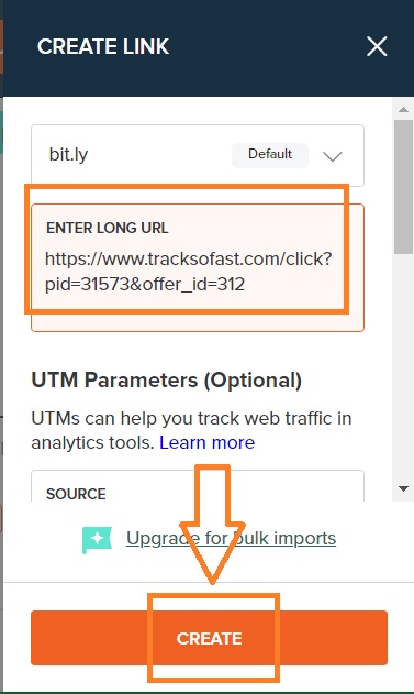 Справа выедет форма для создания короткой ссылки - в поле: "ENTER LONG URL" вставьте ссылку на скопированный оффер и жмите внизу: CREATE
