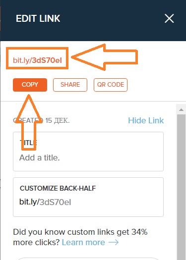 Короткая ссылка успешно создана - под ней жмём по кнопке: COPY