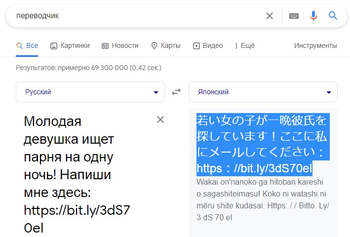 Затем открываем Google Переводчик и слева на русском языке вводим примерно такой текст и вставляем в него короткую ссылку: