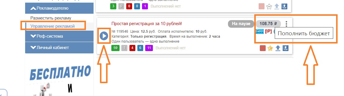 Теперь необходимо активировать задание: Для этого открываем раздел: "Рекламодателю" и переходим в подраздел: "Управление рекламой", справа жмем на баланс задания - пополняем на необходимую сумму с основного или рекламного счёта и напротив задания жмём по кнопке: "Пуск"
