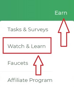 Теперь переходим на сайт PlayNANO вверху по центру открываем кнопку: "Earn" и переходим в раздел:"Watch & Learn"