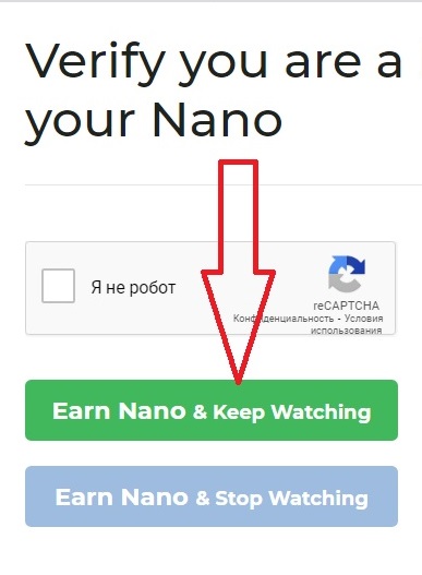 Продолжаем процесс просмотра видеороликов,пока не дойдём до конечной точки, где необходимо решить капчу и нажать по кнопке: "Earn Nano & Keep Watching"