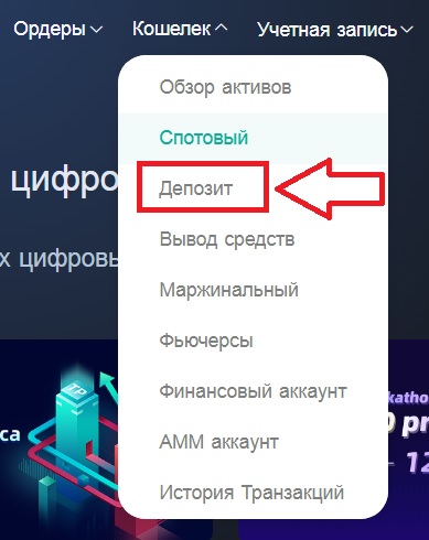 После регистрации на бирже CoinEx на вашу почту придёт письмо с ссылкой для активации аккаунта. После входа в личный кабинет в верхней центральной части сайта найдите раздел: "Кошелёк" и откройте второй пункт меню: "Депозит" как показано на скришоте: