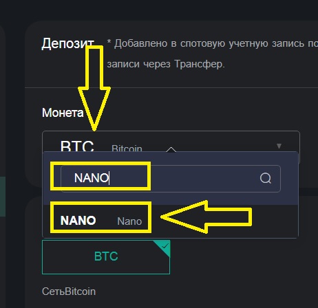 Немного ниже, по центру - найдите поле для поиска нужной криптвалюты: жмите на надпись BTC, откроется поле для поиска, введите в него: NANO, жмите Enter, после чего, ниже - вы увидите результат поиска.