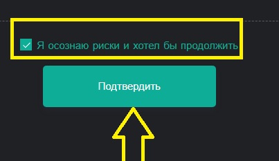 Откроется информационное окно: поставьте галочку напротив "я осознаю риски и хотел бы продолжить", ниже жмите "Подтвердить"