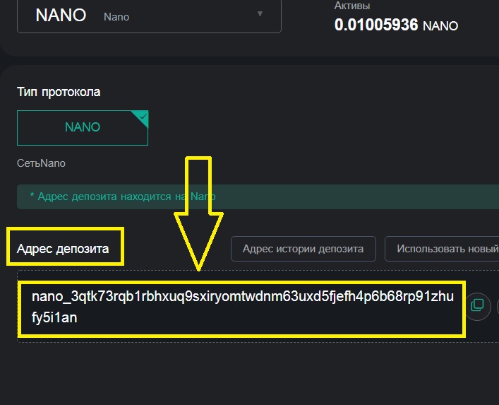 В форме депозита, которая перед вами открылась, полностью копируем адрес НАНО, при помощи кнопки копирования.Обратите внимание, что минимальная сумма для депозита на биржу составляет: 0.01 НАНО